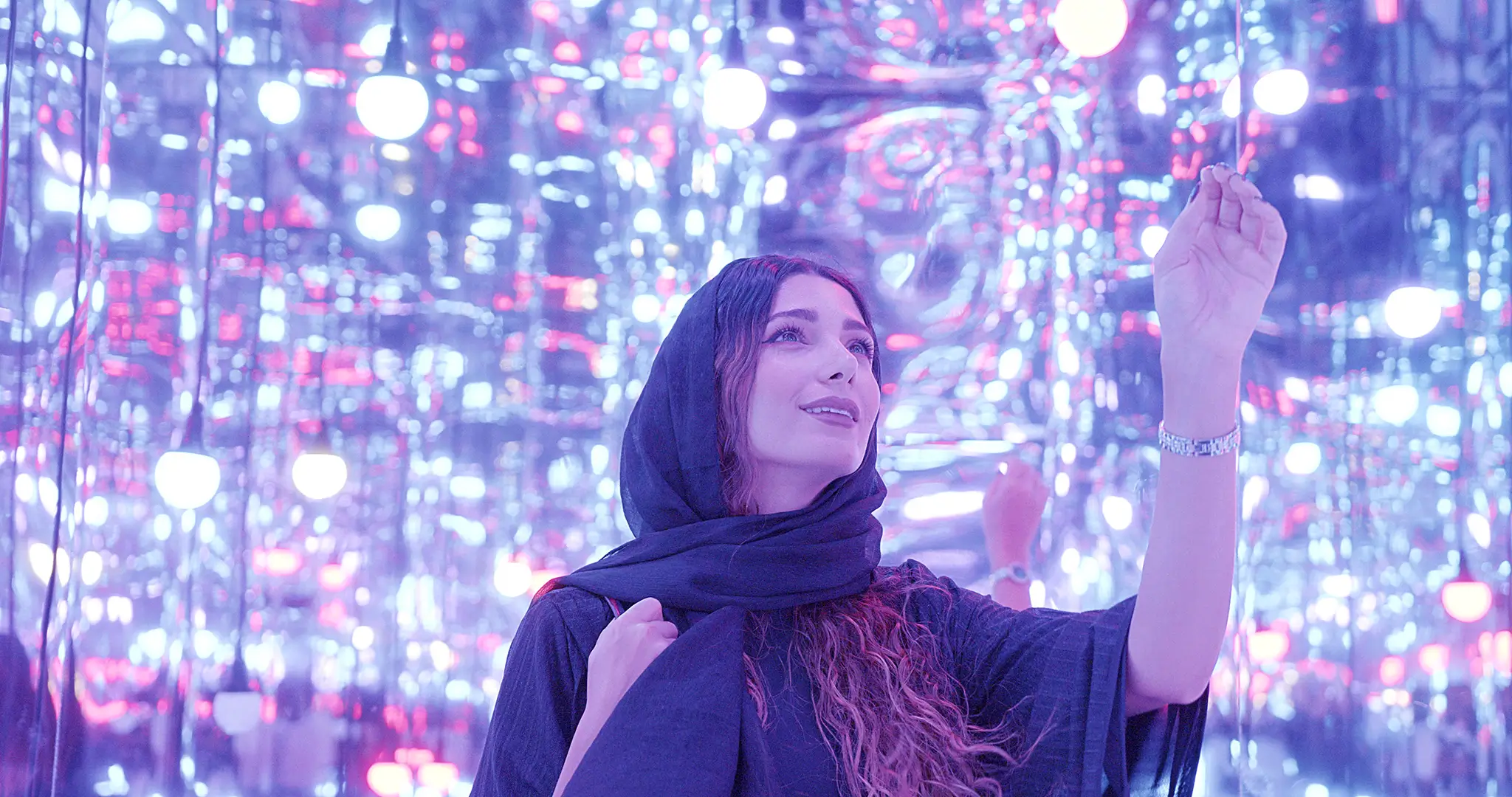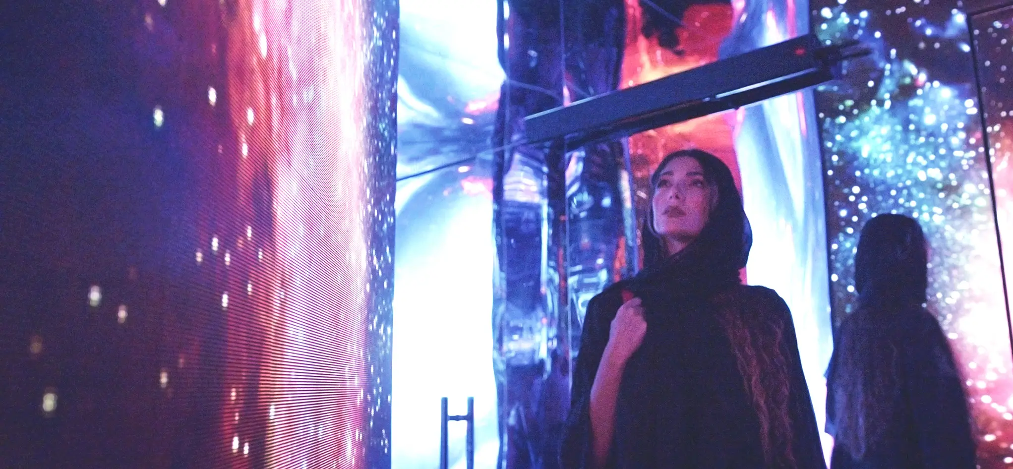 The AR Portal was equipped with a room with plain black walls and a doorway in the middle. Upon looking through the doorway through a tablet, the viewer can see two eras of Oman, one being Oman in the 1980s and the other being Oman in its near future flourished with technological advancements.