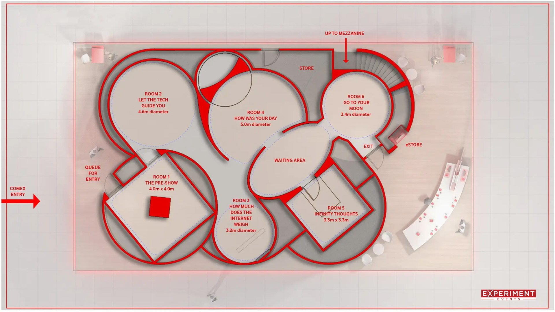 The third room invokes curiosity in the audience by asking the question what if the internet had weight? The room invites the audience with a detailed video explaining more about the weight of the internet. Then the viewer is welcomed to an interactive arena where they can calculate the actual weight of the internet with a one-of-a-kind touch-and-throw experience.